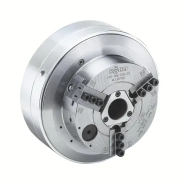Силовой патрон со встроенным пневматическим цилиндром и цилиндрическим центральным креплением. Трёхкулачковое исполнение с зубчатой насечкой 90°.