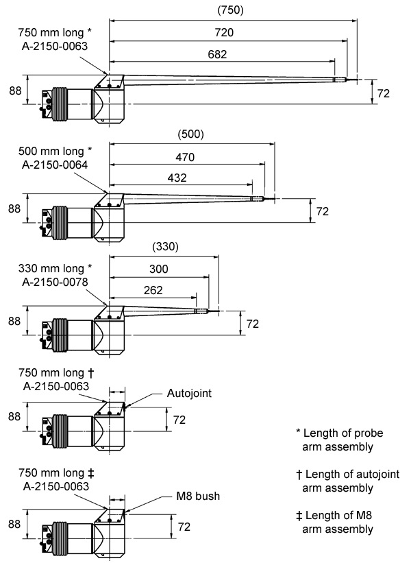 Для системы PHS1 доступны четыре типа датчиков.| HE 750 | Рука со встроенным удлинителем из углеродного волокна и втулкой M8, обеспечивающий длину 750 мм с сенсорным датчиком Renishaw TP20. |