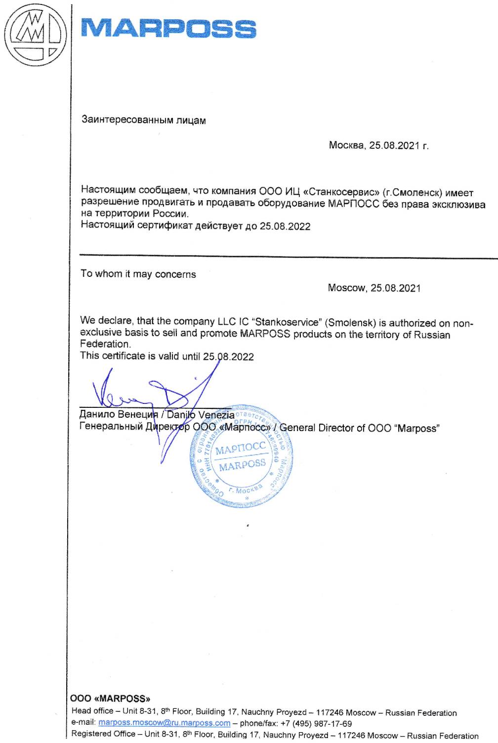 Компания конструирует и производит продукцию для авиакосмической промышленности, автомобилестроения, энергетики, других отраслей промышленности. Marposs стремится предоставлять передовые решения, позволяющие контролировать качество и технологические процессы в цеховой среде. Основное производство находится в Бентивольо (Италия).